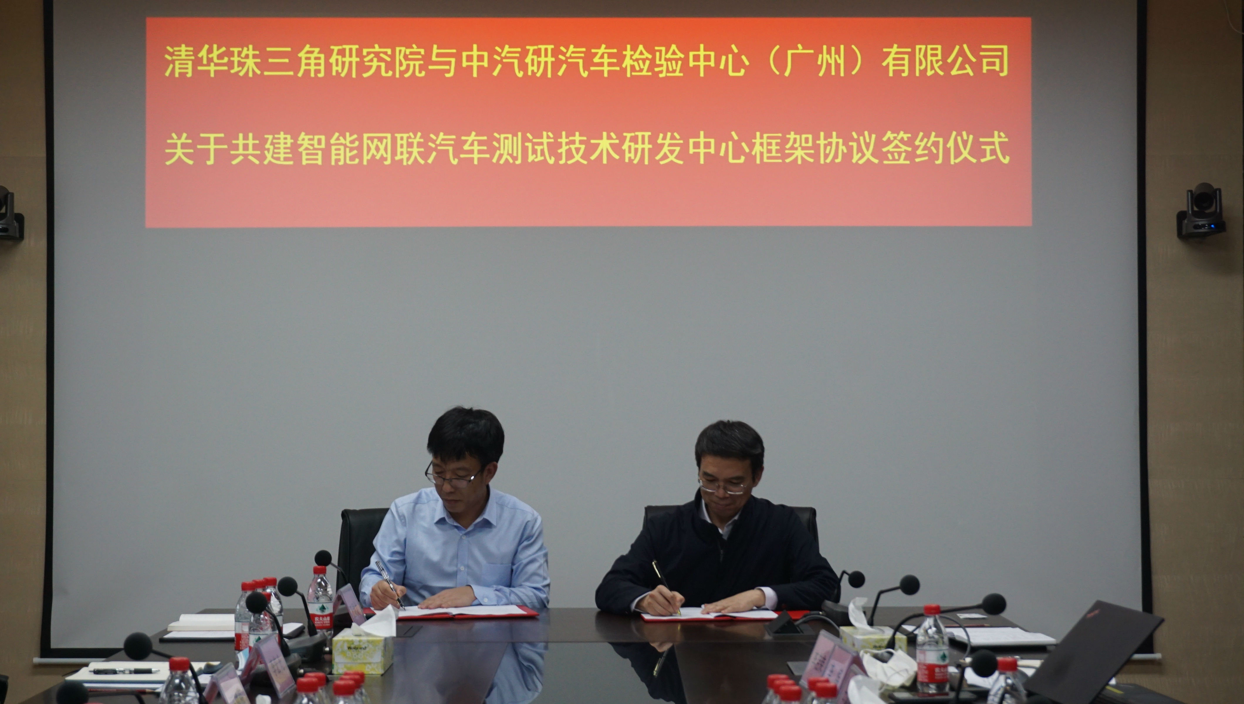 我院与中汽研汽车检验中心(广州)有限公司签署共建智能网联汽车测试技术研发中心合作协议 发表日期:2020-03-27 3月20日,清华珠三角研究院与中汽研汽车检验中心(广州)有限公司在研究院总部大楼举行了共建协议签约仪式。清华珠三角研究院常务副院长王德保,中汽研汽车检验中心(广州)有限公司总经理王建海出席并代表双方签署协议。 智能网联汽车测试技术研发中心将发挥共建双方科研资源优势,聚焦粤港澳大湾区智能网联汽车行业,承接广东省、广州市等重大科技攻关项目,引领智能网联汽车测试技术研究,助力国家智能汽车创新发展战略实施及大湾区智能网联汽车行业发展。
