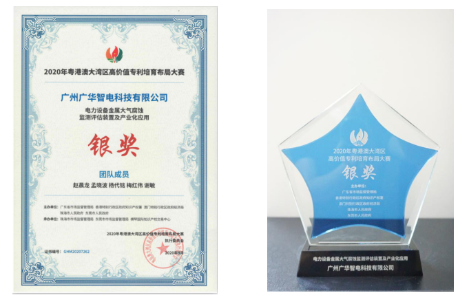 我院重点孵化企业在粤港澳大湾区高价值专利培育布局大赛中获银奖 发表日期:2020-09-07 9月2日,由广东省市场监督管理局、香港特别行政区政府知识产权署、澳门特别行政区政府经济局、珠海市人民政府、东莞市人民政府主办的“2020年粤港澳大湾区高价值专利培育布局大赛”在珠海收官,我院重点孵化企业广州广华智电科技有限公司专利项目“电力设备金属大气腐蚀检测评估装置及产业化应用”获得银奖。