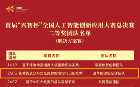 “长输管道分布式光纤智能感知与识别技术”项目荣获全国人工智能创新应用大赛总决赛二等奖 发表日期:2023-03-07 近日,由工业和信息化部、科学技术部、深圳市人民政府共同主办的首届“兴智杯”全国人工智能创新应用大赛总决赛在深圳举行。大赛以“兴智赋能”为主题,吸引来自全国全部省级行政区以及美、加、英、澳等其他11国共计1.6万余人报名参加,涌现出一批技术领先、思路新颖、效果出众的算法模型。我院能源先进测控技术与装备研发中心研发的“长输管道分布式光纤智能感知与识别技术”项目荣获总决赛二等奖。
