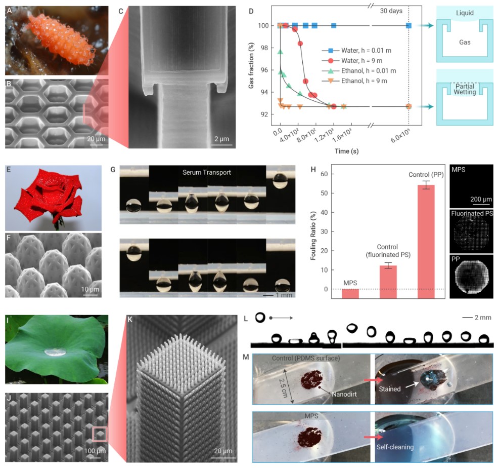 MPS表面举例 (A-D)利用双倒檐结构在浸没状态滞留气泡的仿弹尾虫表面 (E-H)利用黏附性差异操控液滴的仿玫瑰花瓣表面 (I-M)利用层级结构实现高疏水性的仿荷叶表面
